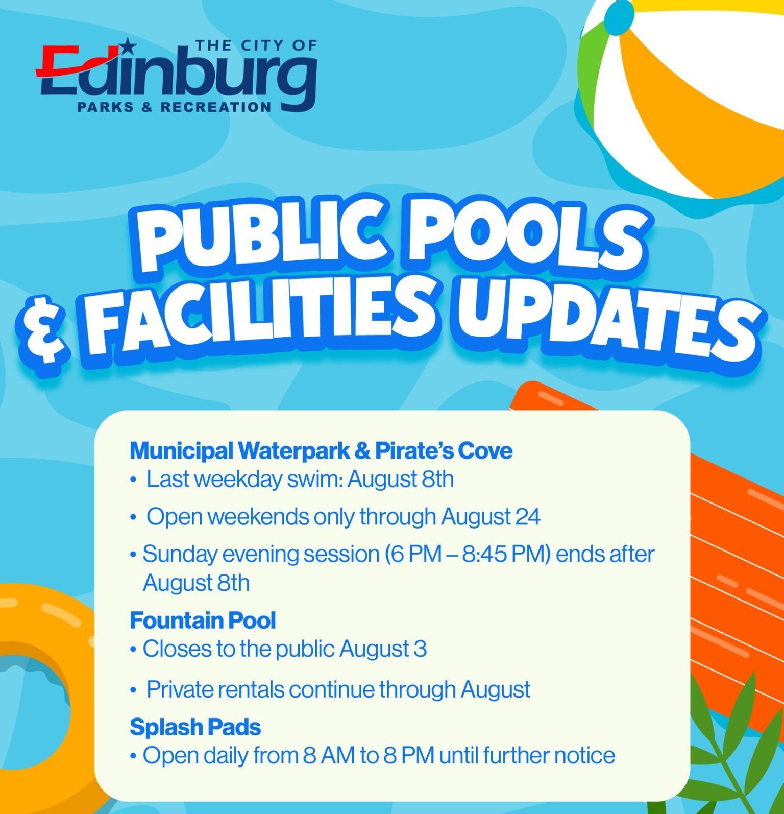 EDINBURG, TX – The City of Edinburg has announced changes to public pool and aquatic facility schedules for the month of August, marking the approach of the end of the summer swimming season.