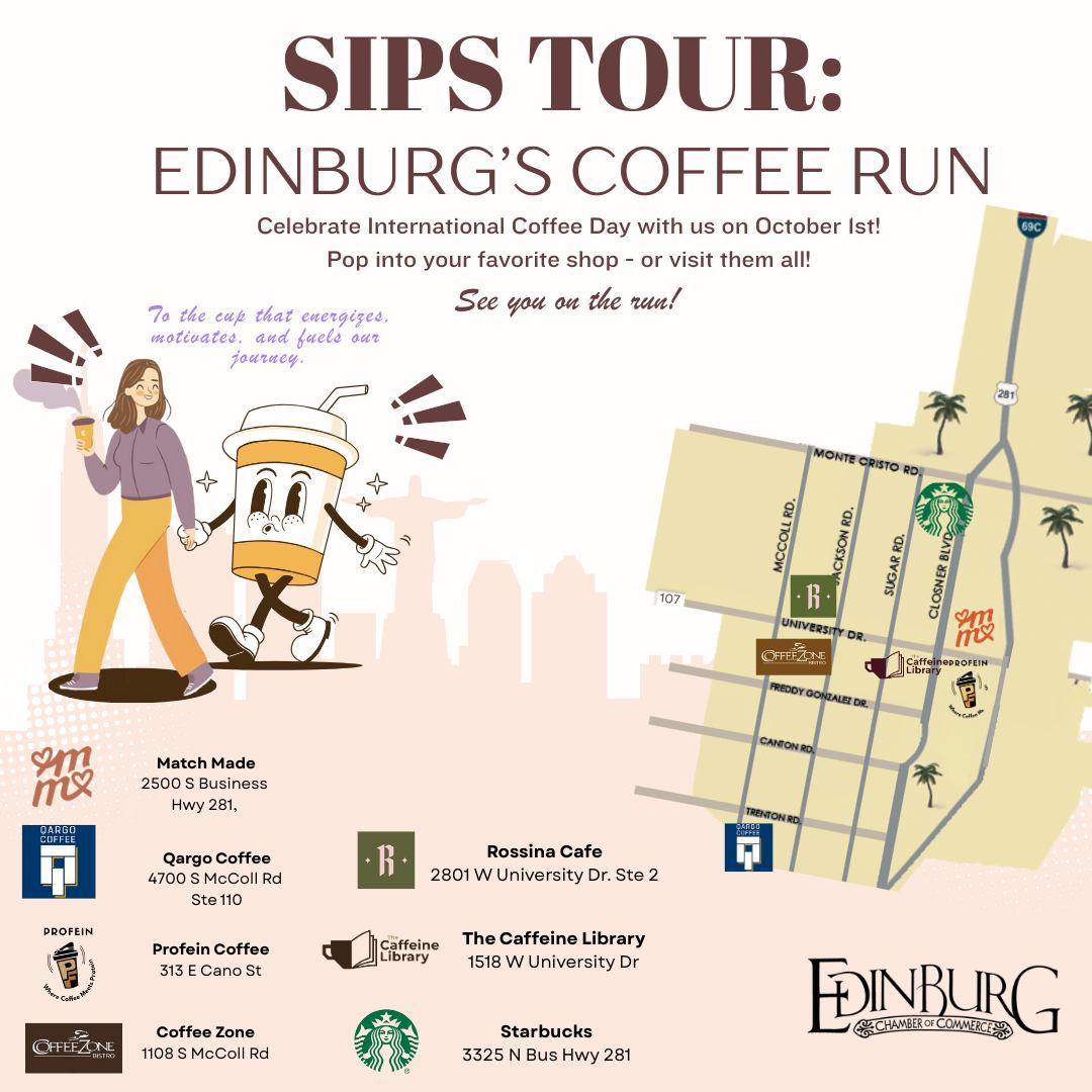 Edinburg, TX – Coffee lovers will have a reason to celebrate on Tuesday, Oct. 1, as the Edinburg Chamber of Commerce hosts its “Sips Tour: Edinburg’s Coffee Run” in recognition of International Coffee Day.