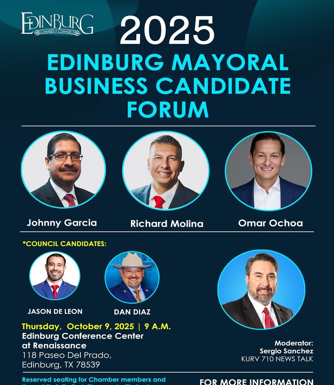 Originally planned for a smaller space, the Oct. 9 forum will now be held in the auditorium of the Edinburg Conference Center at Renaissance, increasing seating capacity from 300 to 800. Chamber leaders said the change reflects the strong response from both businesses and residents.