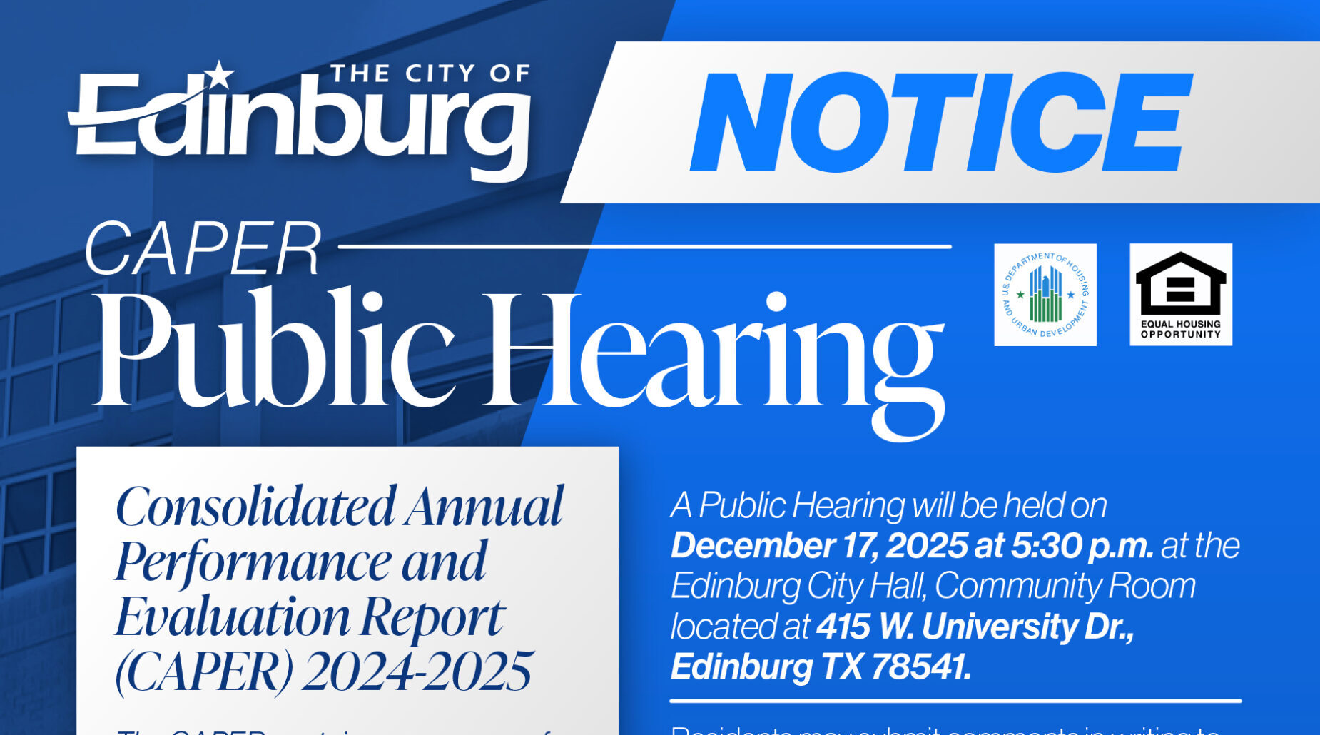 Edinburg, TX – The City of Edinburg will host a public hearing Dec. 17 to present its Consolidated Annual Performance and Evaluation Report (CAPER) for the 2024–2025 program year, outlining how federal Community Development Block Grant (CDBG) funds were used to support projects and services in the community.